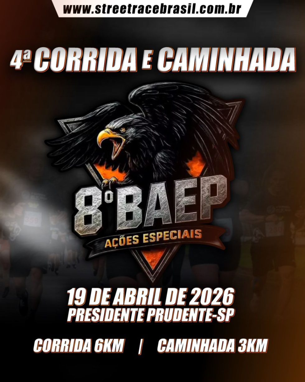 A Polícia Militar do Estado de São Paulo, por meio do 8º Batalhão de Ações Especiais de Polícia – 8º BAEP, informa que estão abertas as agendas para entrevistas sobre a 4ª Corrida e Caminhada do 8º BAEP, que ocorrerá no dia 19 de abril de 2026, com largada e chegada na Sede do 8º BAEP – Presidente Prudente
