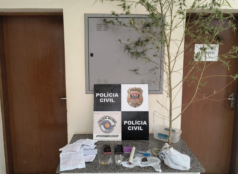 Na sequência, segundo o boletim de ocorrência, o homem indicou que poderia haver mais drogas na residência da mulher. Com o consentimento dos dois, as equipes se deslocaram até o imóvel indicado, onde localizaram um pé de maconha no quintal, um invólucro da mesma droga dentro de um quarto e diversos objetos utilizados para fracionamento e embalagem de entorpecentes, além de anotações relacionadas ao sistema prisional.