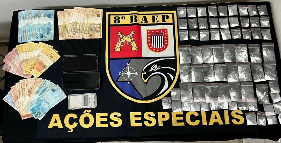 Com o outro homem de 21 anos, localizadas 05 (cinco) porções de cocaína e aparelho celular, informando que em sua residência haveria mais. Na busca domiciliar foram apreendidas 44 (quarenta e quatro) porções de cocaína, R$ 1.036,00 e mais um aparelho celular.