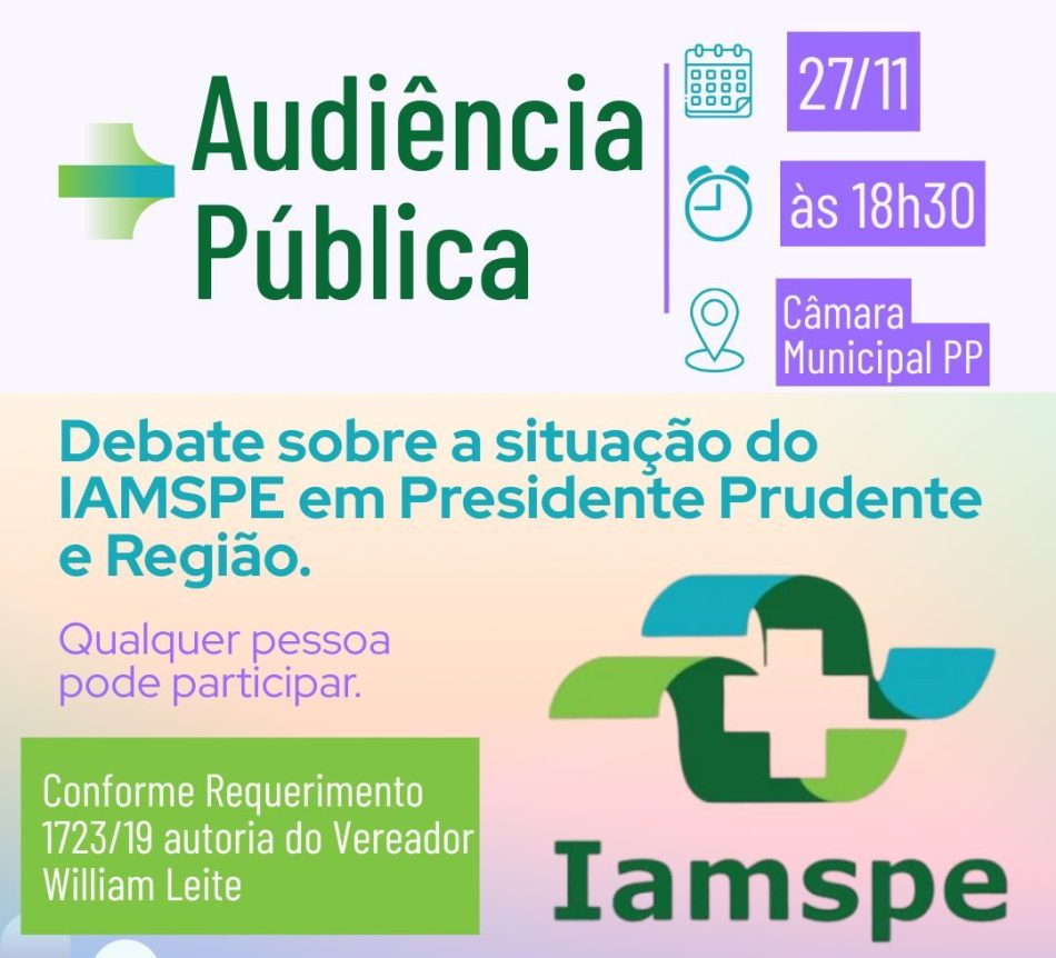 A Câmara Municipal de Presidente Prudente promoverá, no dia 27 de novembro de 2025, por volta das 18h30, uma Audiência Pública para discutir a situação crítica do atendimento oferecido pelo IAMSPE no município e em toda a região. O encontro foi convocado para reunir servidores públicos estaduais, dependentes, autoridades e a população interessada em buscar melhorias no serviço.