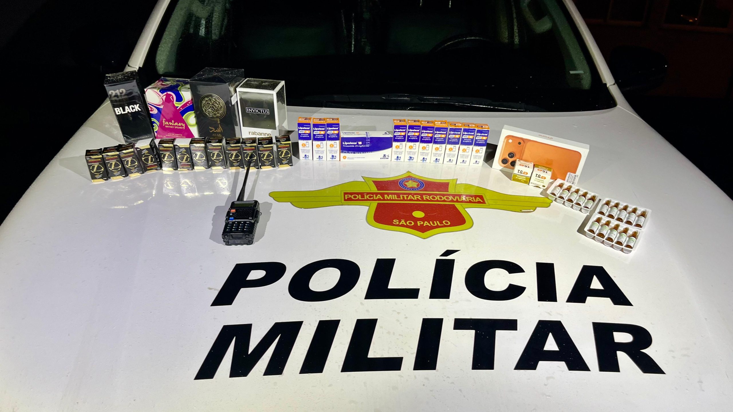 Durante a fiscalização, os policiais realizaram vistoria no porta-malas do carro e localizaram diversos produtos de origem estrangeira sem documentação fiscal. Entre os itens apreendidos estavam medicamentos para emagrecimento, anabolizantes, perfumes, um aparelho iPhone 17 Pro Max e um rádio comunicador.