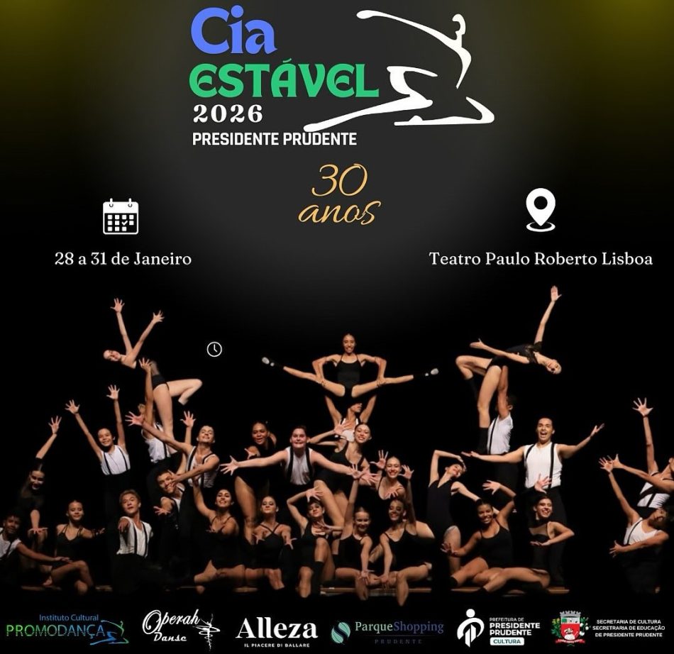 O Teatro Paulo Roberto Lisboa, da Secretaria Municipal de Cultura de Presidente Prudente (Secut), recebe a Cia Estável 2026, com grandes apresentações artísticas para o público, de 29 a 31 de janeiro, e entrada solidária, apenas 1 kg de alimento não perecível, itens que serão revertidos a entidades assistenciais.