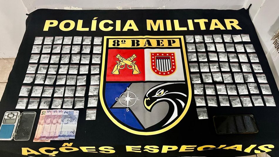 O homem de 25 anos com antecedentes criminais afirmou que em sua residência haveria mais embalagens. Na busca domiciliar localizadas mais 90 embalagens da mesma droga e uma balança de precisão doméstica.
