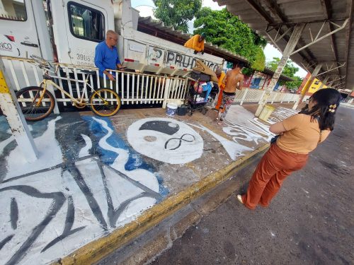 De acordo com o boletim de ocorrência, policiais militares prestavam apoio à Secretaria Municipal de Assistência Social na abordagem de pessoas em situação de rua, quando perceberam que o homem havia pintado o chão do terminal com tinta e pincel. Ele fez desenhos e escreveu frases em grande parte do piso, atingindo pelo menos duas das quatro baias de parada de ônibus.