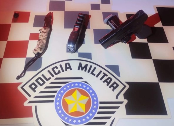 Ele foi abordado pela PM e que fez busca pessoal, sendo localizado um simulacro de pistola, uma arma de choque e um canivete.
