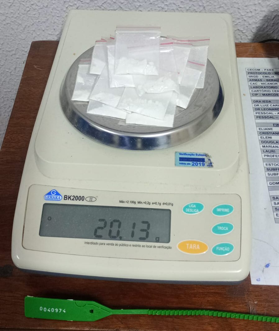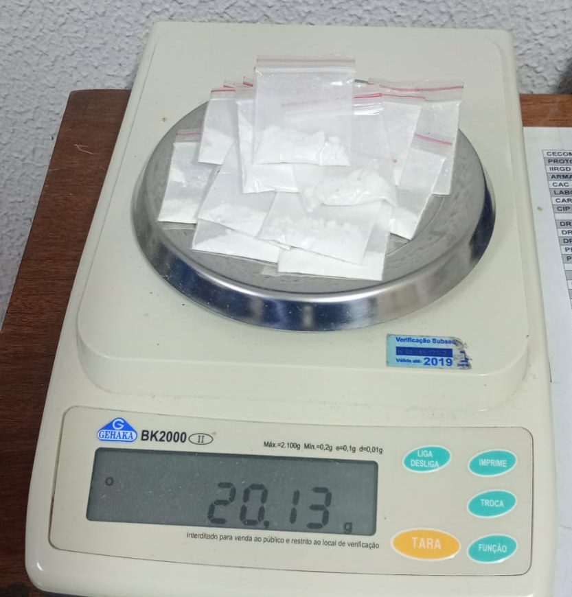 Ao todo, foram apreendidas 19 porções de cocaína, totalizando cerca de 20,13 gramas, além de 17 saquinhos plásticos vazios e um celular Samsung Galaxy J7.