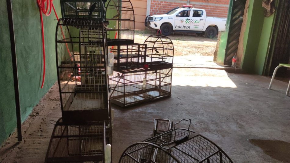 Em contato com morador, um homem de 71 anos, tomou conhecimento do motivo da fiscalização e acompanhou a equipe pela área externa da residência onde foi constatada a manutenção em cativeiro de 24 aves da fauna silvestres nativas mantidas em gaiolas sendo 22 da espécie coleirinha papa capim e 02 canários da terra, sendo que no momento da fiscalização um deles (canário da terra) encontrava-se com alçapão armado e acoplado a gaiola, ou seja, sendo utilizado como chama para captura de aves da mesma espécie.