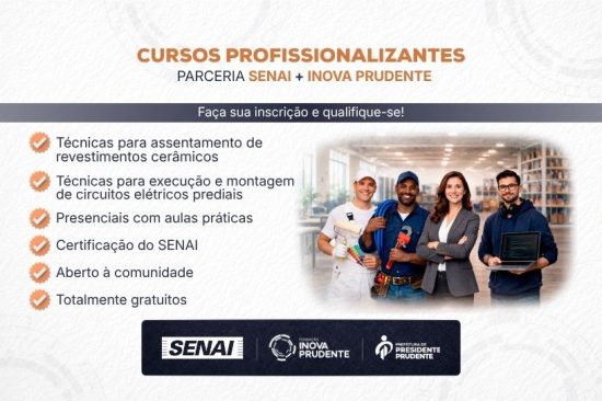 A Inova Prudente, em parceria com o Senai, está com pré-inscrições abertas para dois novos cursos gratuitos de qualificação profissional: Circuitos Elétricos Prediais e Assentamento de Revestimentos Cerâmicos. As capacitações têm carga horária de 80 horas e visam preparar os alunos para o mercado de trabalho da construção civil.