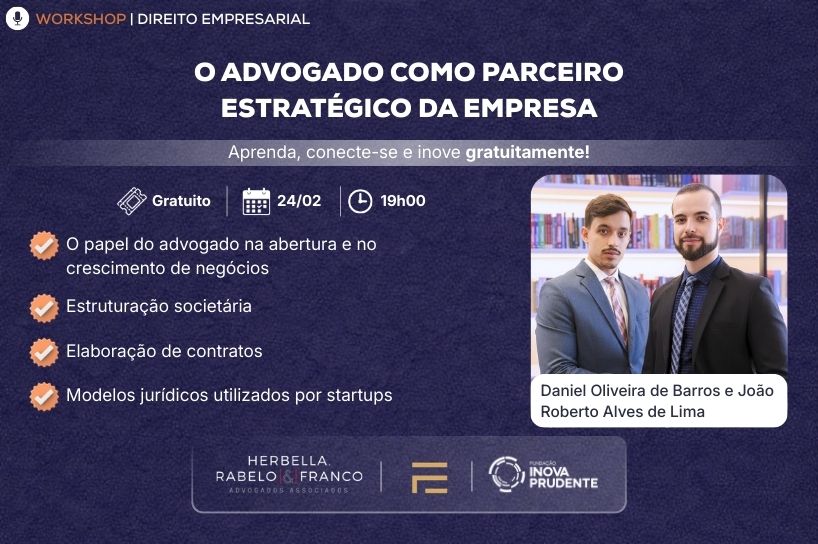 O auditório da Fundação Inova Prudente será palco do workshop “O Advogado como Parceiro Estratégico da Empresa”, realizado em 24 de fevereiro pelo Escritório Edson Freitas de Oliveira Advogados Associados, em parceria com o Herbella, Rabelo & Franco Advogados Associados. O objetivo do evento é difundir conhecimentos práticos sobre o direito empresarial aplicado à realidade de empresas e startups de diferentes portes. As inscrições já estão abertas e podem ser realizadas pelo site.