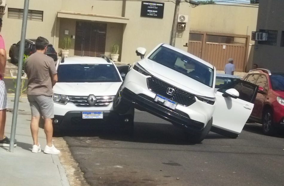 De acordo com as informações apuradas no local, o condutor de uma Honda HR-V perdeu o controle da direção por volta das 9h20 e acabou atingindo uma Renault Duster que estava estacionada na via. Com o impacto, os dois veículos ficaram parcialmente presos um ao outro, chamando a atenção de quem passava pelo trecho.