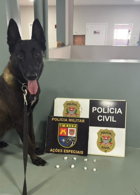 Com apoio do canil do 8º BAEP da Polícia Militar, a cadela farejadora Ravenna localizou porções de drogas dentro do imóvel, além de outros materiais relacionados à investigação.