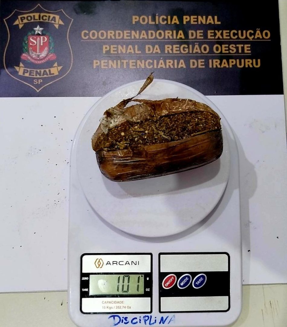 Durante os procedimentos de revista em seus pertences, os policiais penais lograram êxito em encontrar um invólucro que pesou 101 gramas e que continha substância esverdeada, semelhante a maconha.