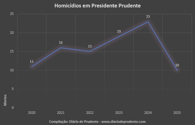 O número de homicídios dolosos registrados em Presidente Prudente teve uma queda significativa em 2025, segundo dados da Secretaria da Segurança Pública (SSP). Enquanto em 2024 foram contabilizados 23 mortes, em 2025 foram registrados apenas 10, o que representa uma redução de 57% em comparação ao ano anterior.