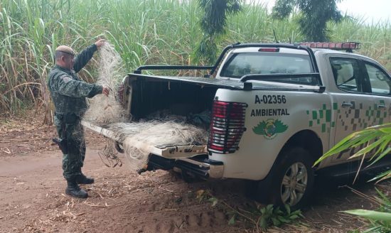 A ação ocorreu nas proximidades da cachoeira do Salto Botelho, local conhecido por registros de pesca predatória e onde a atividade é proibida. Durante a fiscalização, os policiais avistaram dois indivíduos utilizando rede de arrasto.