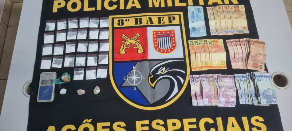 No total, foram apreendidas aproximadamente 17 gramas de crack, 34 gramas de cocaína, além da quantia em dinheiro.