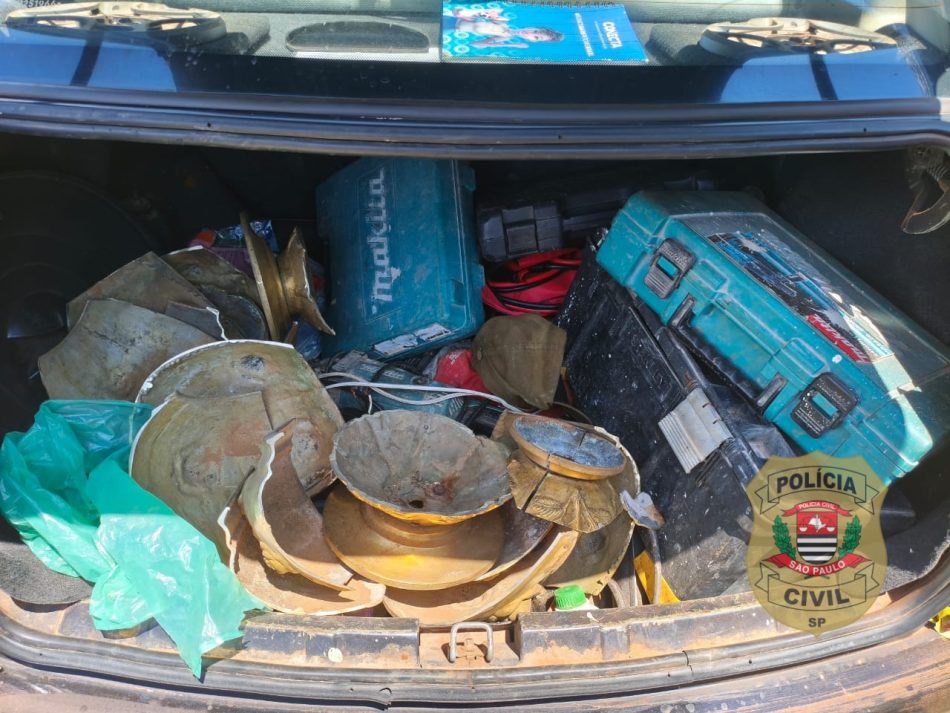 No porta-malas foram encontradas diversas peças de vasos de bronze cortadas, totalizando mais de 38 quilos de material. Os objetos são provenientes de furtos ocorridos no Cemitério Municipal de Junqueirópolis, que havia registrado no dia 12/11 a subtração de sete vasos ornamentais.