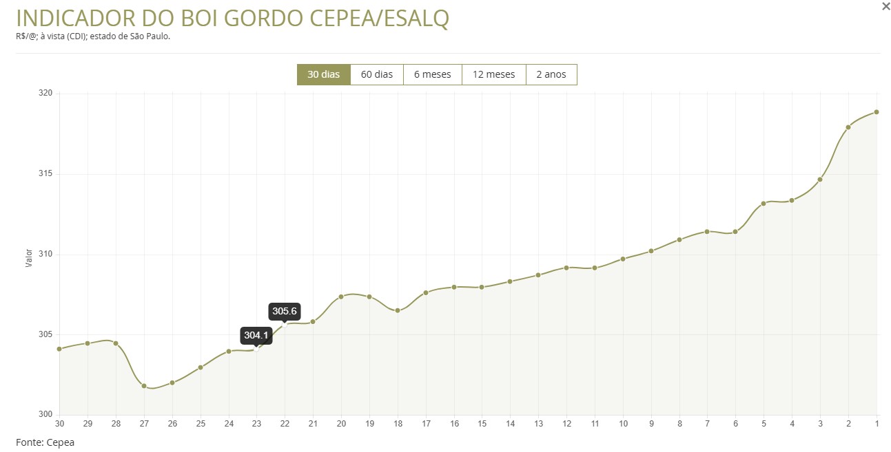 No estado de São Paulo, referência nacional, os negócios foram fechados entre R$ 315 e R$ 320 por arroba. O cenário reforça a firmeza do mercado, sustentado pela oferta moderada e pela demanda consistente das indústrias frigoríficas.