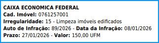 A prefeitura de Presidente Prudente através da Coordenadoria de Fiscalização Urbanística, notificou neste começo de ano diversos proprietários de imóveis da cidade em diversos bairros de Presidente Prudente, para que limpem seus terrenos, arrumem suas calçadas e construam muros, entre outras necessidades urbanisticas. Um dos notificados é a Caixa Econômica Federal, que tem a posse de alguns imóveis no bairro Vida Nova Presidente Prudente II e no Vale do Sol.