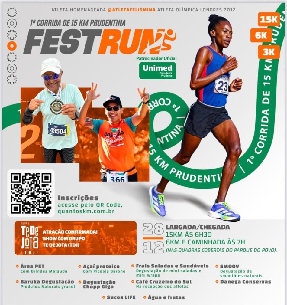 Presidente Prudente encerra o calendário de corridas de rua de 2025 com a realização da 1ª Corrida de 15km Prudentina Fest Run, neste domingo (28). A prova terá largada na Avenida 11 de Maio, em frente à quadra coberta do Parque do Povo e contará com dois percursos para corredores, de 6 km e 15 km, além de um trajeto de 3 km destinado à caminhada. Para garantir a tranquilidade, as vias interditadas foram divulgadas.