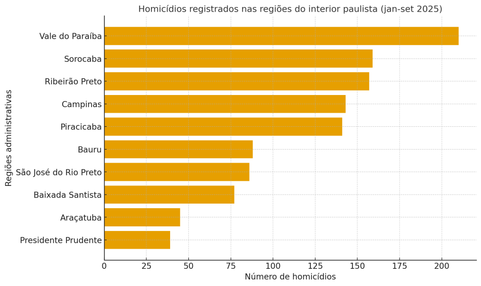 No extremo oposto, o Vale do Paraíba ultrapassou a marca de 210 homicídios, mantendo-se na liderança do ranking e concentrando o maior número absoluto de mortes violentas no interior. Somente em setembro, foram 27 ocorrências, o que elevou o total acumulado do ano. Apesar do número expressivo, a região teve redução de 10,6% em relação ao mesmo período de 2024, quando registrava 235 assassinatos.