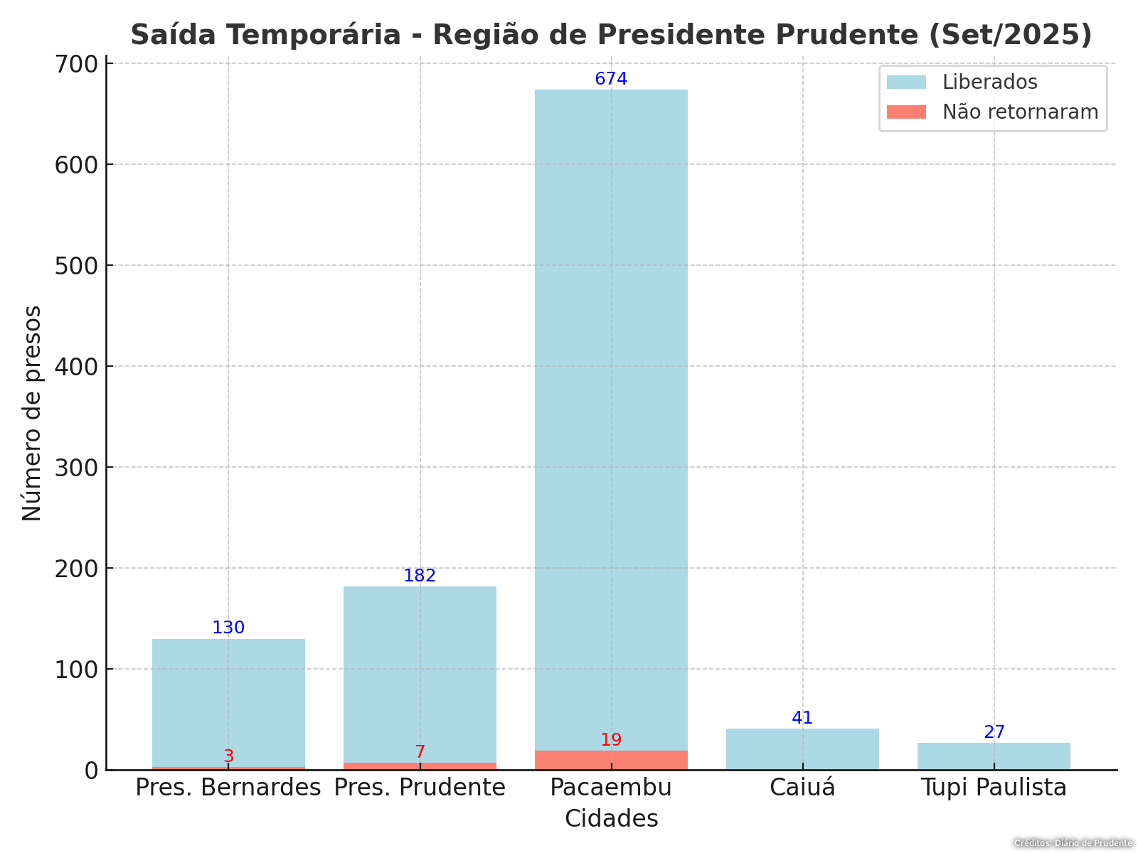 A Secretaria da Administração Penitenciária (SAP) informou ao Diário de Prudente que 29 detentos do regime semiaberto não retornaram às unidades prisionais da região de Presidente Prudente após a saída temporária concedida pelo Poder Judiciário entre os dias 16 e 22 de setembro de 2025. O benefício é previsto na Lei de Execução Penal e autorizado conforme Portaria DEECRIM 02/2019 e suas complementações.