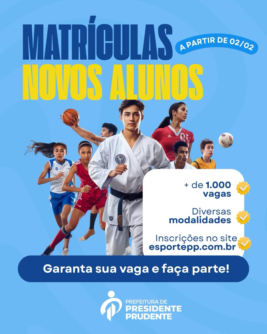 A prefeitura de Presidente Prudente, por meio da Secretaria Municipal de Esportes (Semepp), anuncia novas oportunidades para oficinas esportivas em 2026. Há mais de 1.000 vagas, divididas em nove diferentes modalidades: atletismo, badminton, basquetebol (feminino e masculino), futsal  (feminino e masculino), futebol (feminino e masculino), handebol, judô, karatê, kung fu, natação e voleibol (feminino, masculino e misto).