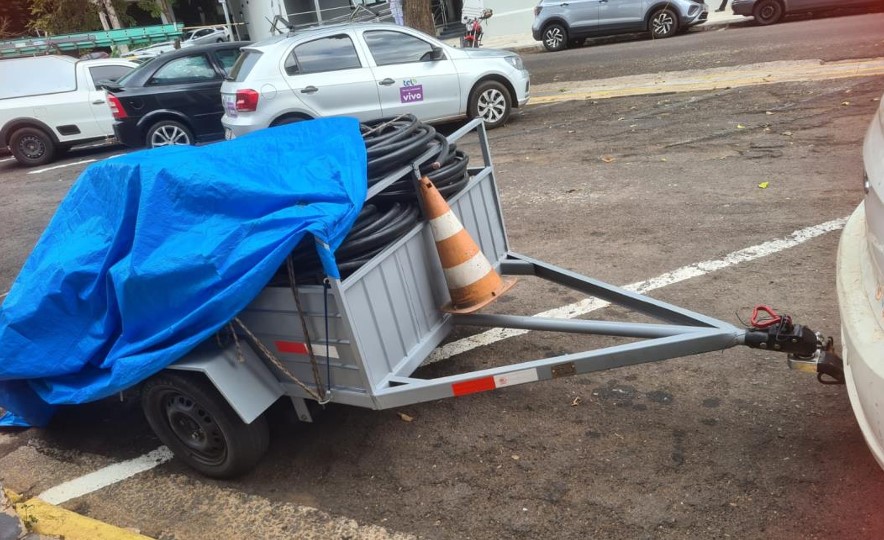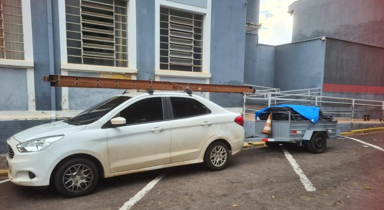 No local, os policiais flagraram três homens realizando a extração de cabos de cobre. Aproximadamente 480 metros de cabo par metálico bitola 50/200, utilizados em comunicação telefônica, já haviam sido removidos. O material, avaliado em cerca de R$ 50 mil, estava sendo carregado em um veículo Ford/Ka branco, com placas de Cascavel (PR), que tracionava uma carretinha e não possuía identificação empresarial.
