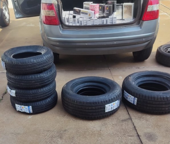 Ao chegarem no local, os policiais constataram se tratar de uma ocorrência de contrabando e descaminho. No interior do veículo havia apenas o banco do condutor, sendo localizado 01 aparelho celular, 20 pneus importados de marcas e tamanhos distintos, 57 maços de cigarros, 07 perfumes importados e 02 mochilas com roupas usadas.